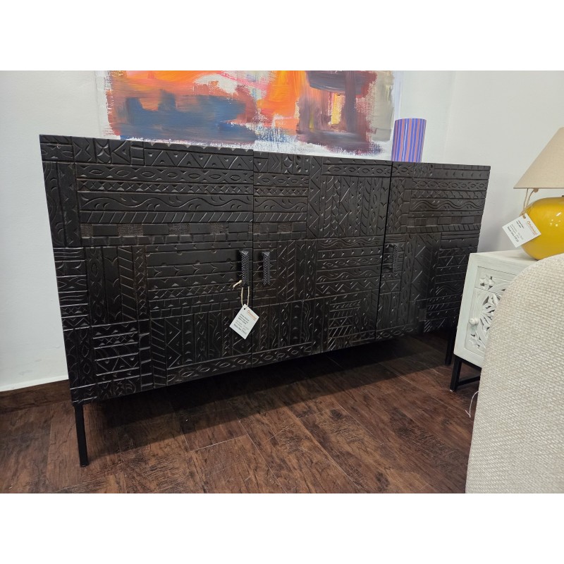 KOMODA Z LITEGO DREWNA MANGO Z 4 RZEŹBIONYMI DRZWIAMI I WEWNĘTRZNYMI PÓŁKAMI.