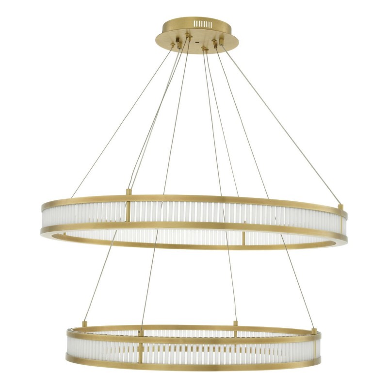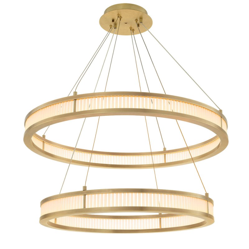 Zjawiskowy żyrandol Eichholtz Damien Duble w stylu art déco. Połączenie antycznego mosiądzu i matowego szkła, które odbija i rozprasza światło w unikalny sposób tworząc niesamowity nastrój. Dwa pierścienie o średnicach 85 i 70 cm i wysokości 8 cm wypełnione są matowymi szklanymi pręcikami.