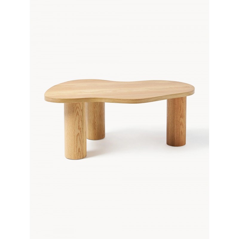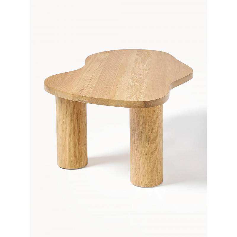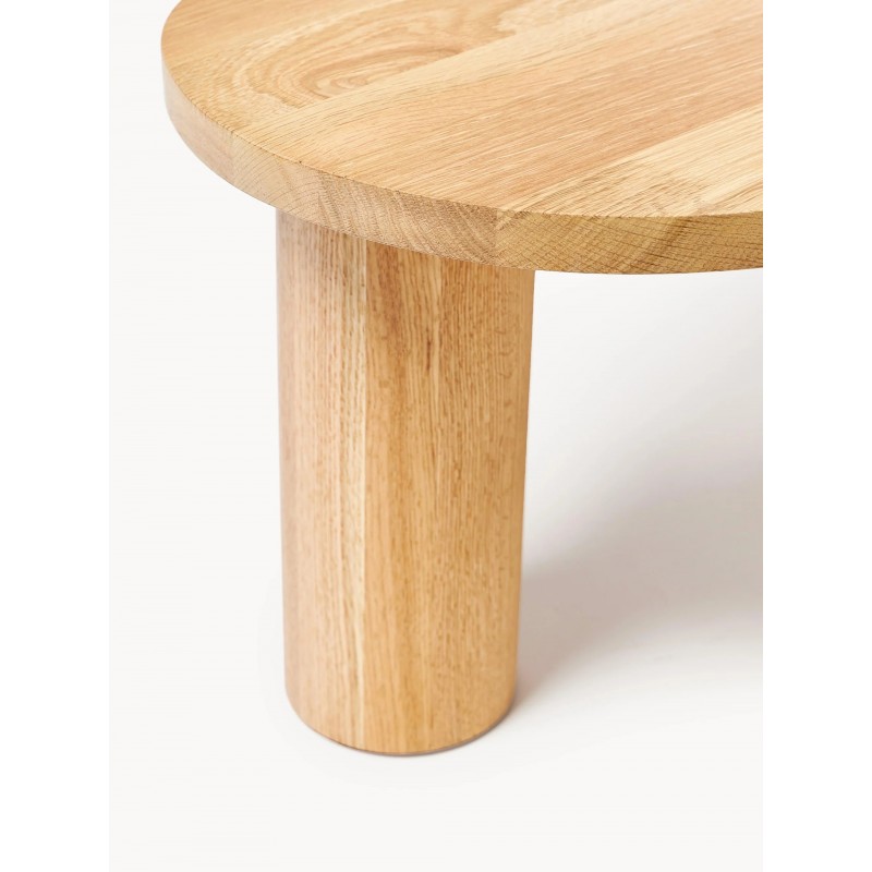 Wyróżnia się okrągłymi, szerokimi nogami oraz blatem z litego drewna dębowego w odcieniu naturalnym, lakierowany.