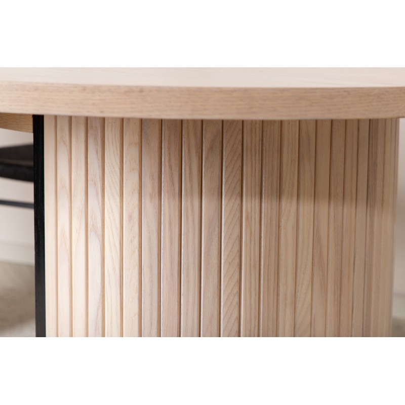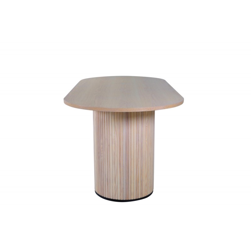 Bianca tworzy stylowy, przyciągający wzrok mebel, który robi wrażenie! Ten owalny stół jadalny w kolorze bielonego dębu charakteryzuje się nowoczesnym designem z półokrągłymi ryflowanymi nogami. Podkreśli atmosferę salonu i zaprosi Cię do wielu przyjemnych posiłków w przyszłości!
