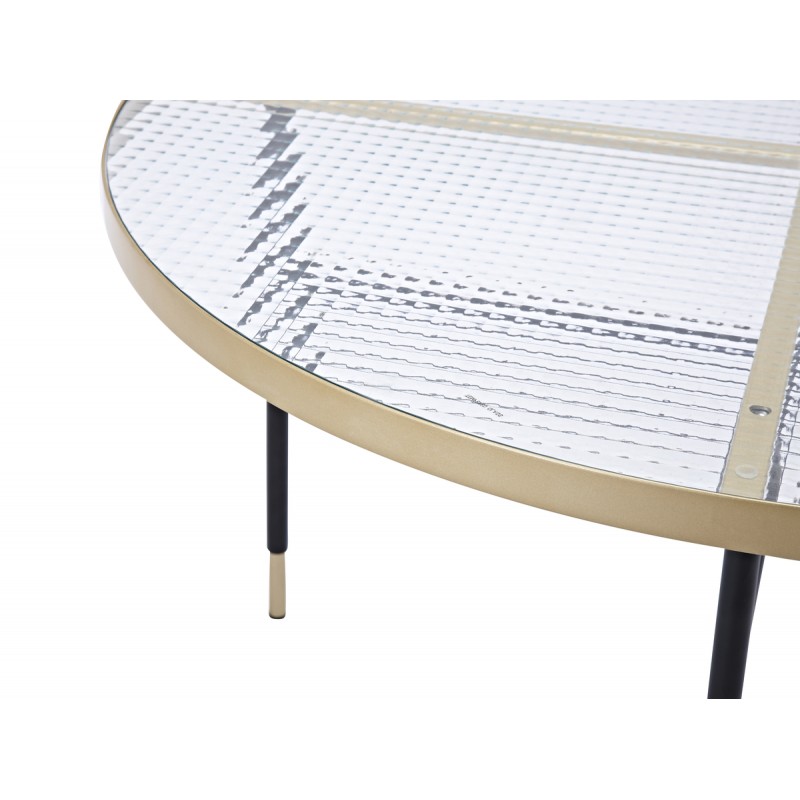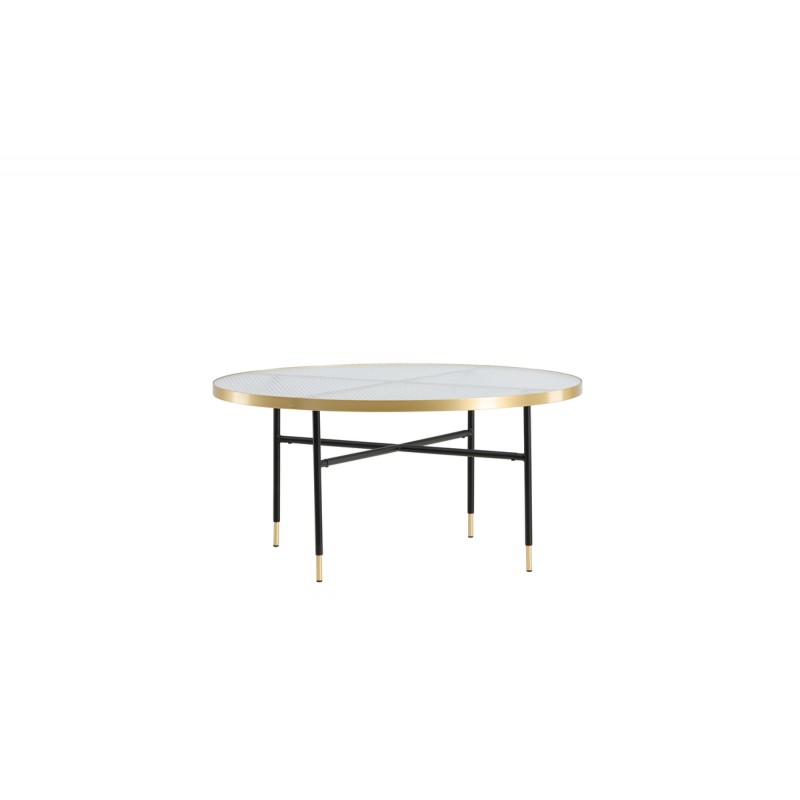 Bubbles to okrągły stolik kawowy z ozdobnym, wzorzystym szklanym blatem, otoczony piękną, mosiężną ramą. Stolik ma czarne, stalowe nogi z mosiężnymi zakończeniami, które idealnie pasują do ramy. Eleganckie nogi w połączeniu z wysokością stolika nadają salonowi lekkości. Postaw go przed sofą i udekoruj pasującą dekoracją, aby stworzyć przytulny i ciepły salon.