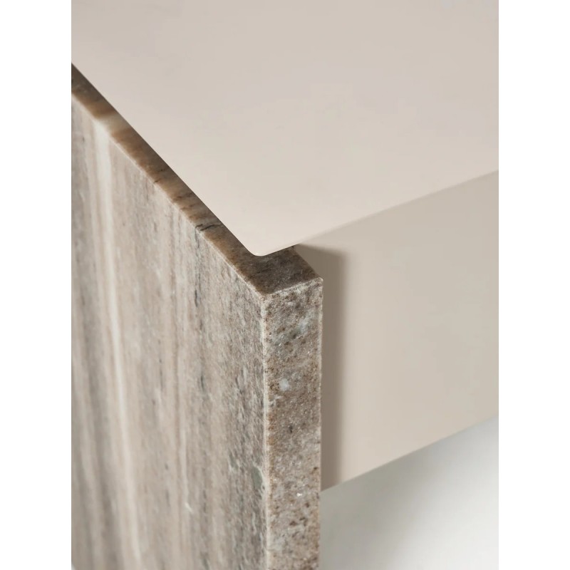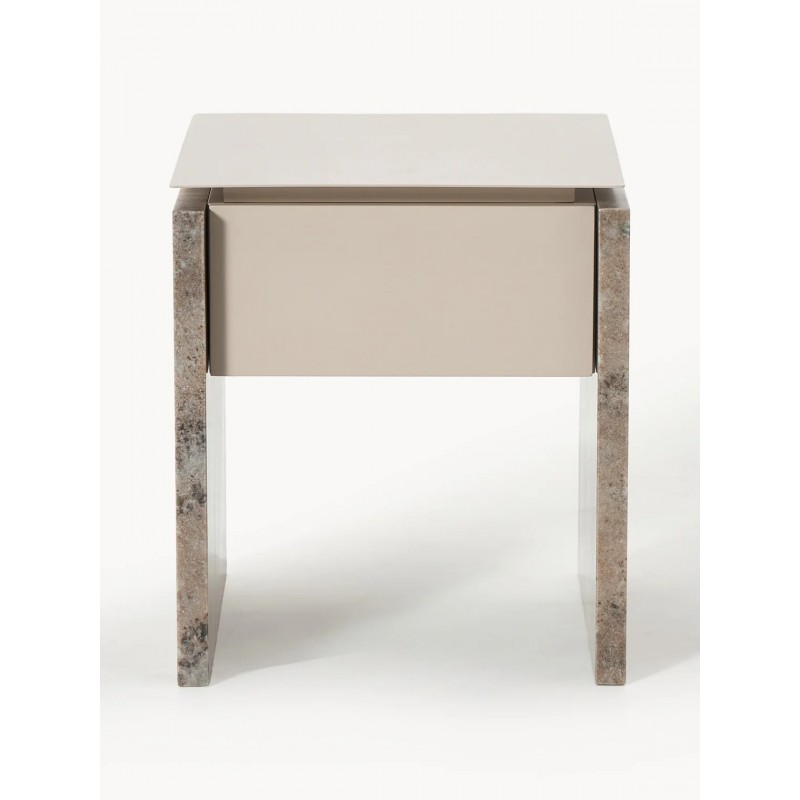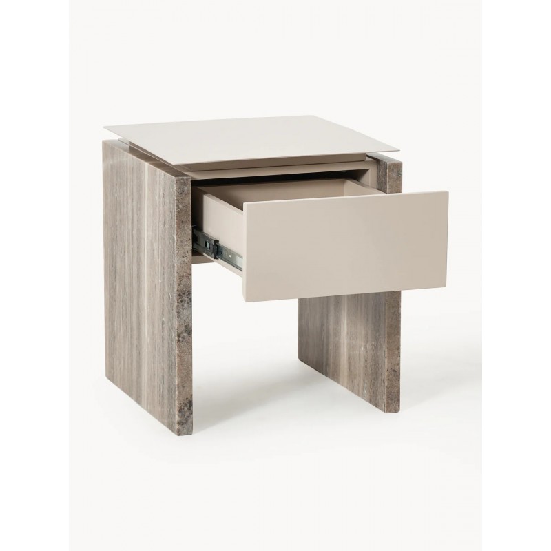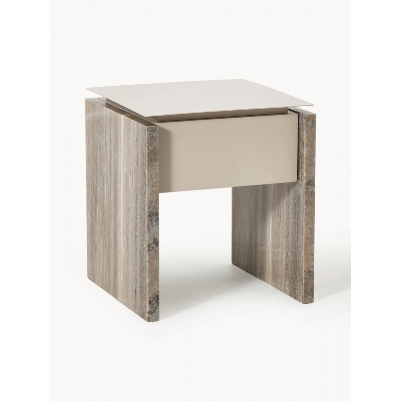 Niezwykłe połączenie metalu i kamienia, cienkiego blatu i kamiennych boków. Produkt posiada szufladę. Szuflada posiada mechanizm Soft-Close. Marmur jest materiałem pochodzenia naturalnego, dlatego produkt może nieznacznie różnić się kolorem i kształtem od przedstawionego na zdjęciu.