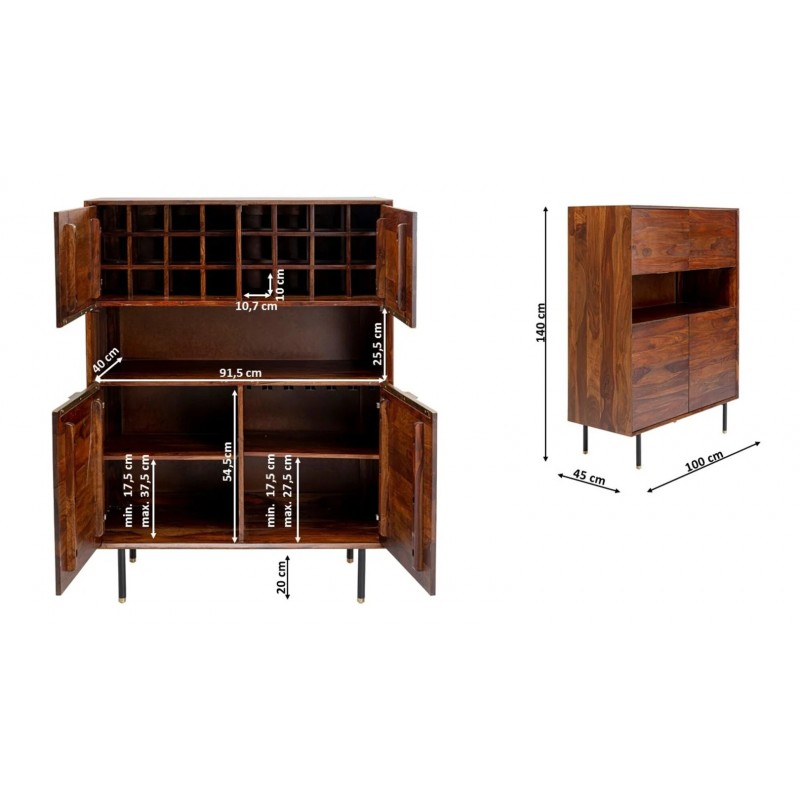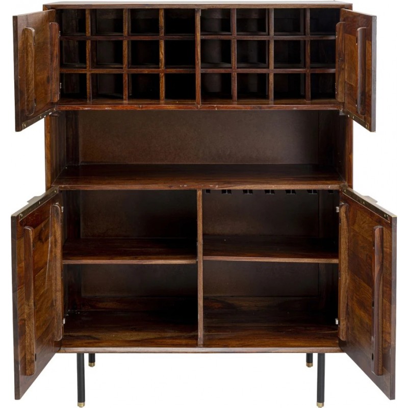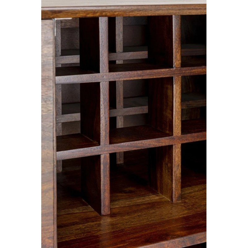 Klimatyczna komoda/barek Ravello stworzona z niepowtarzalnego naturalnego materiału - drewno sheesham, którego naturalna kolorystyka jest niepowtarzalna. Mebel z dedykowaną przestrzenią na 24 butelki i mocowaniem 5 rzędów kieliszków , dodatkowo dwie półki i część otwarta.