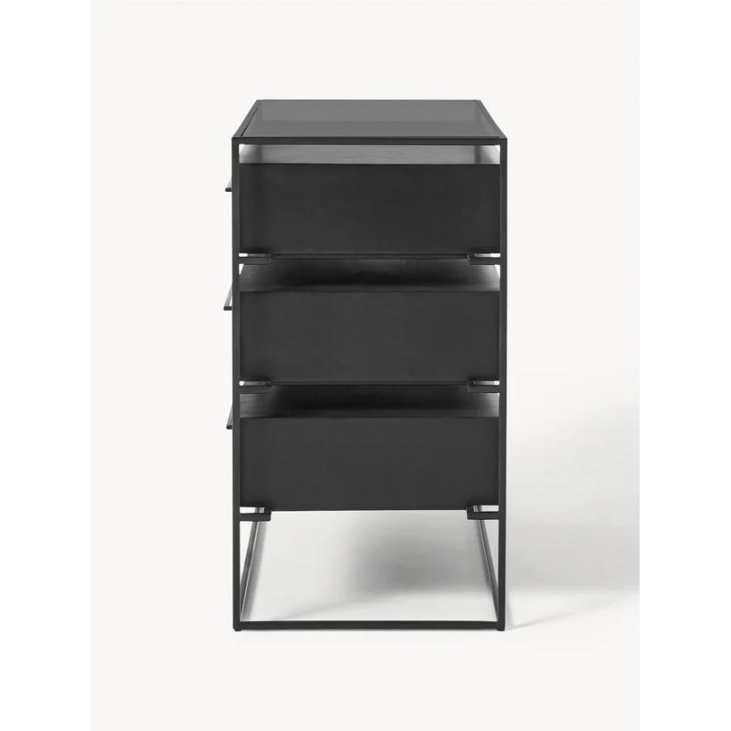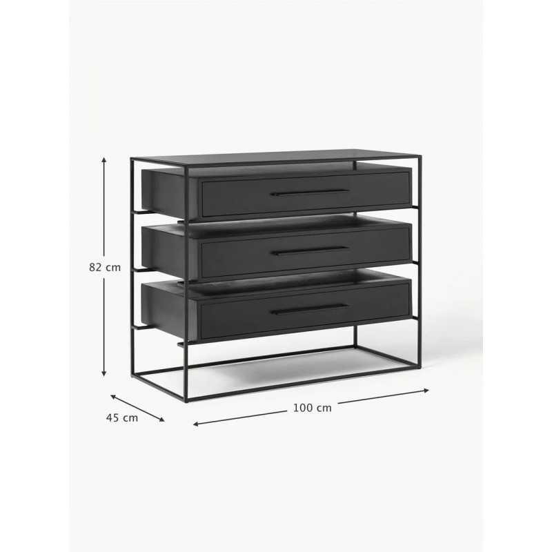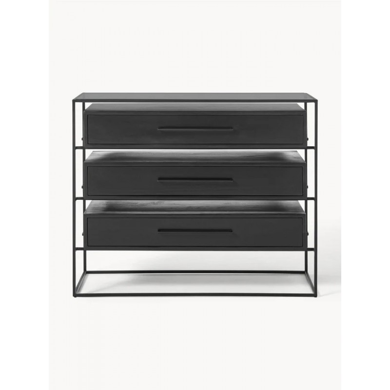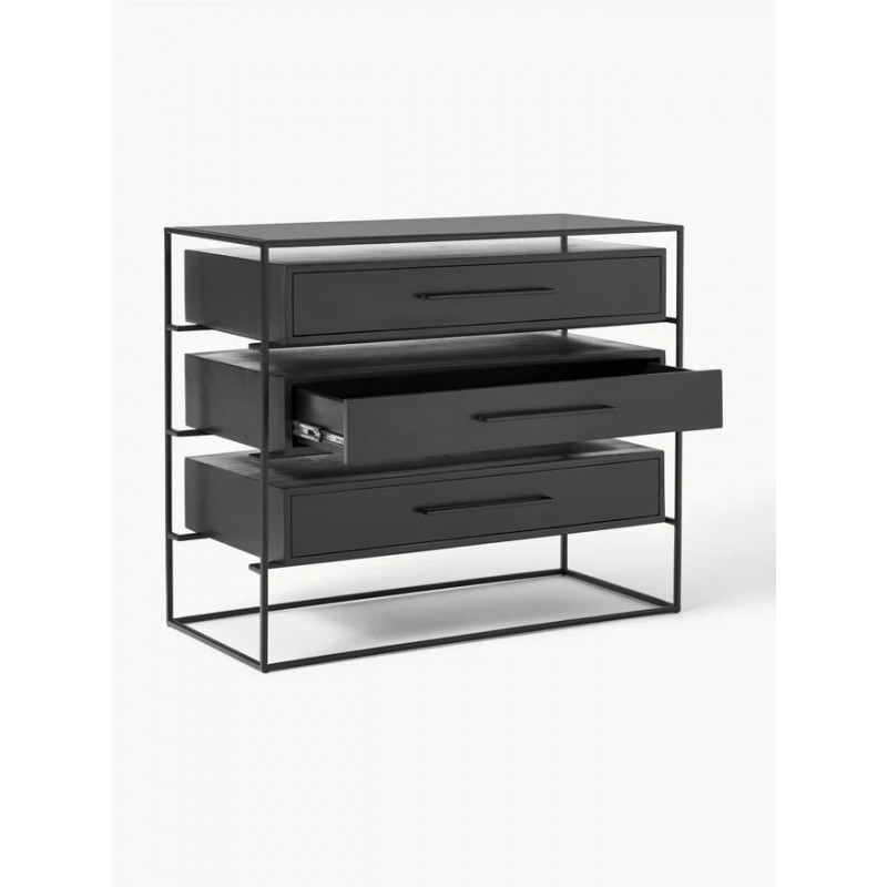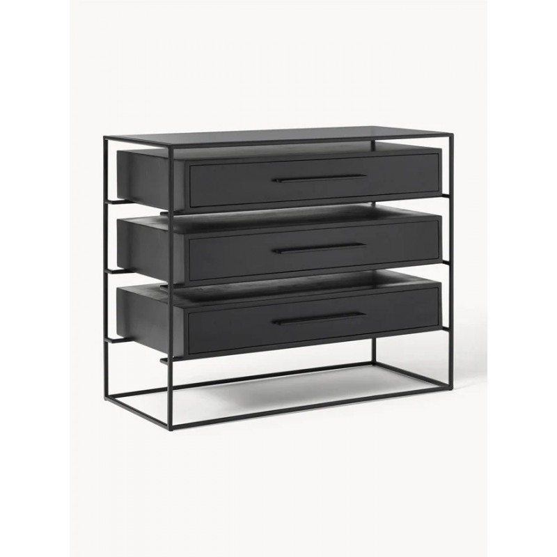Szuflady: lite drewno mangowe, lakierowane Rama i uchwyt: metal malowany proszkowo Półka: szkło