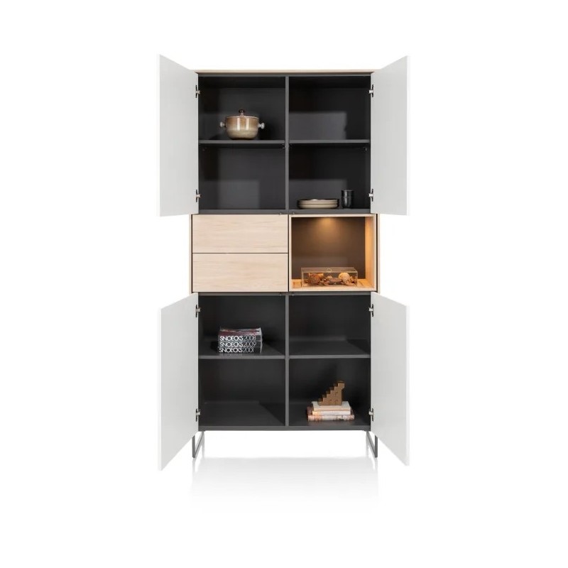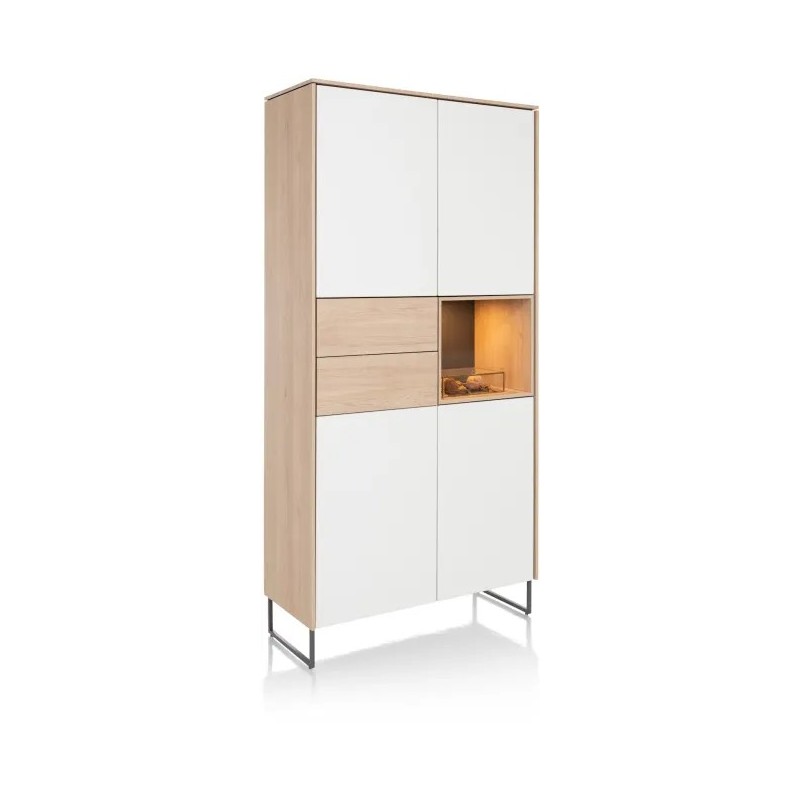 Uwielbiasz minimalistyczny design we wnętrzach i masz dużo rzeczy? Pozwól, aby LINDFIELD Cię zaskoczył! Ta bezuchwytowa szafka z białymi frontami ma 4 drzwi, 2 szuflady i 1 wnękę podświetlaną diodami LED, a elementy w kolorze dębu nadają jej charakter.
