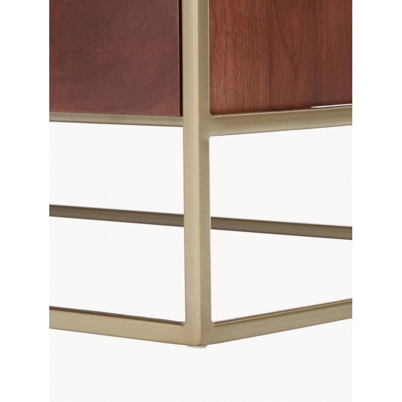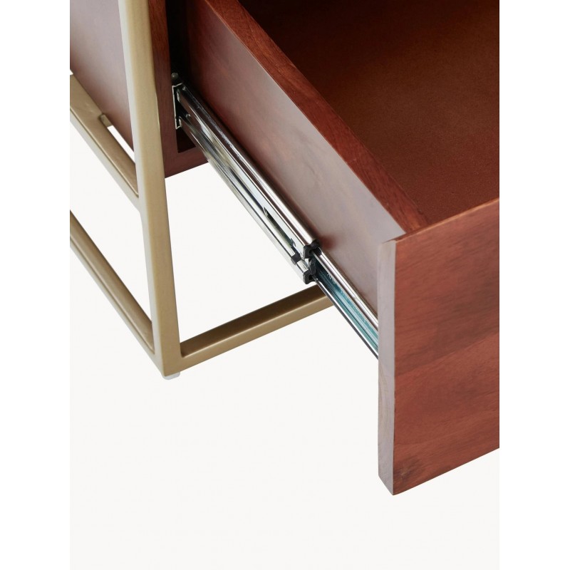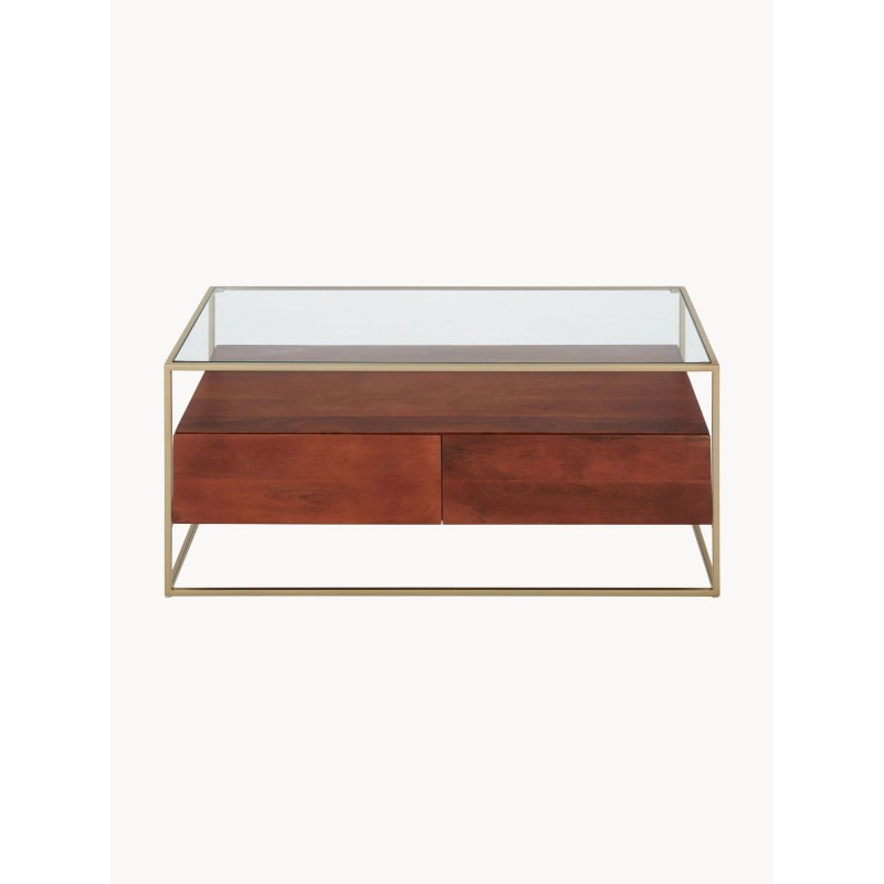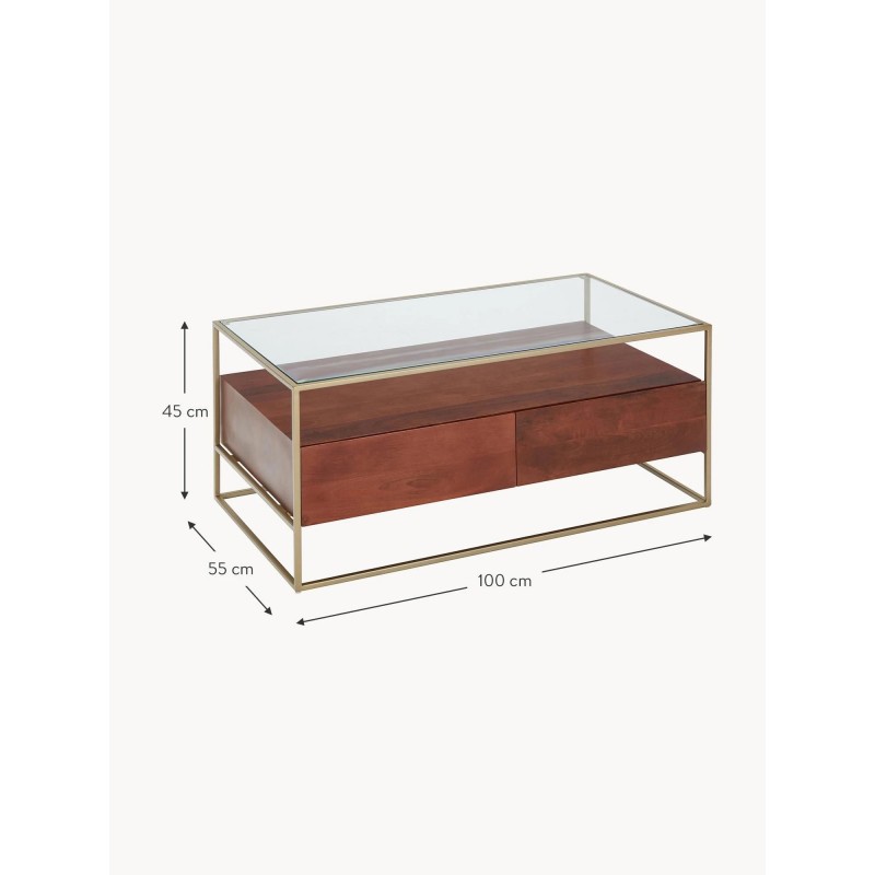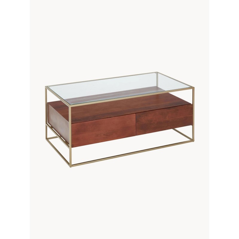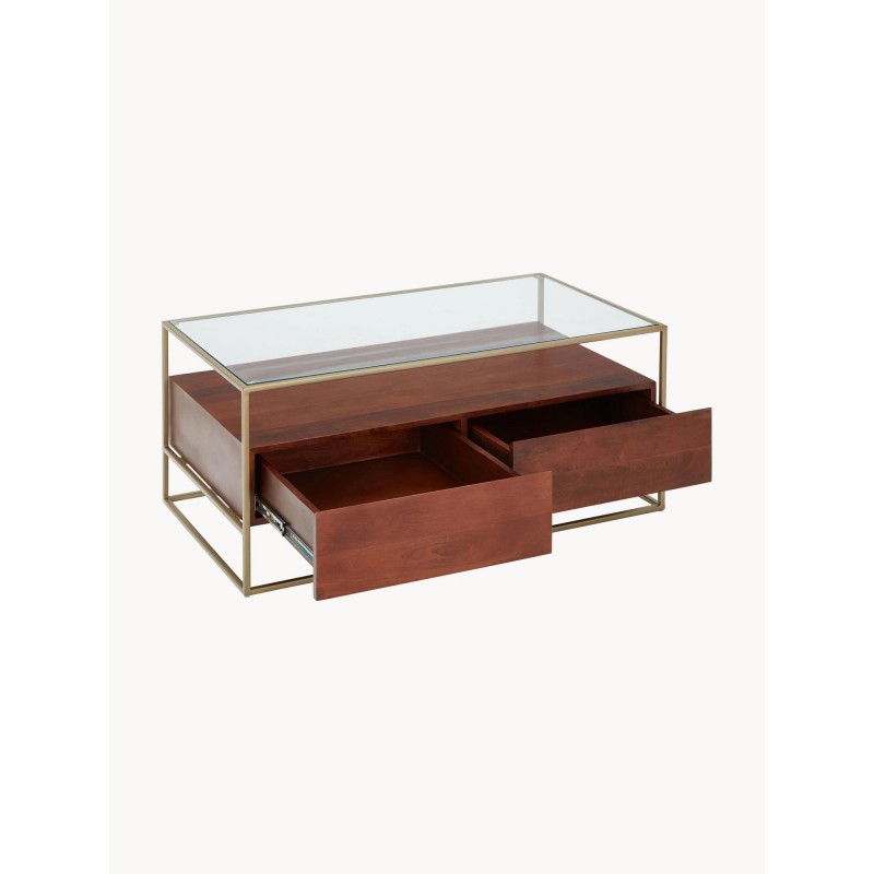Stolik kawowy Theodor to wyjątkowe połączenie elegancji i funkcjonalności. Jego przezroczysty blat ze szkła harmonijnie komponuje się z drewnem szuflad i złotą, matową ramą metalową, tworząc niepowtarzalny mebel, który stanie się centralnym punktem każdego salonu.