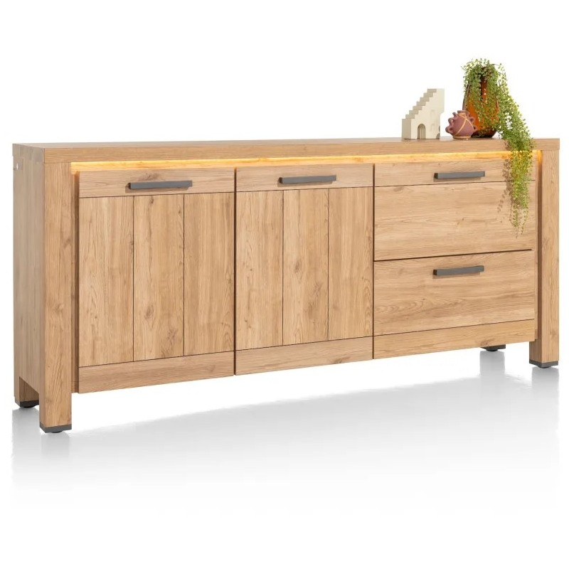 Komoda Delmonte charakteryzuje się klasycznym, rustykalnym wyglądem z nowoczesnym akcentem. Ta idealna szafka posiada dwie szuflady i dwoje drzwiczek, zapewniając mnóstwo miejsca na Twoje rzeczy. Mebel wygląda solidnie, ale został wykonany z wyjątkowo łatwego w pielęgnacji laminatu Primo Laminato w naturalnym, dębowym wykończeniu, dzięki czemu jest praktycznie nie do odróżnienia od prawdziwego drewna.