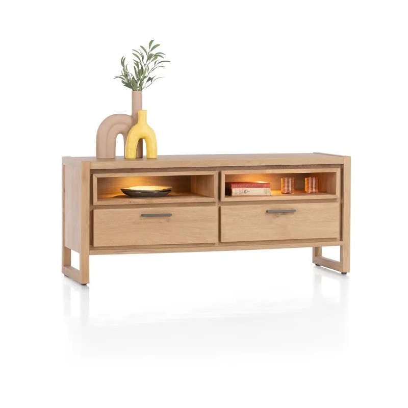 Ten piękny regał, wykonany z forniru dębowego w ciepłym, naturalnym kolorze, ma 140 cm szerokości. Ten mebel łączy funkcjonalność i elegancję.