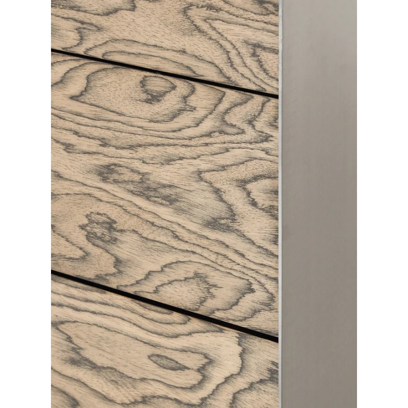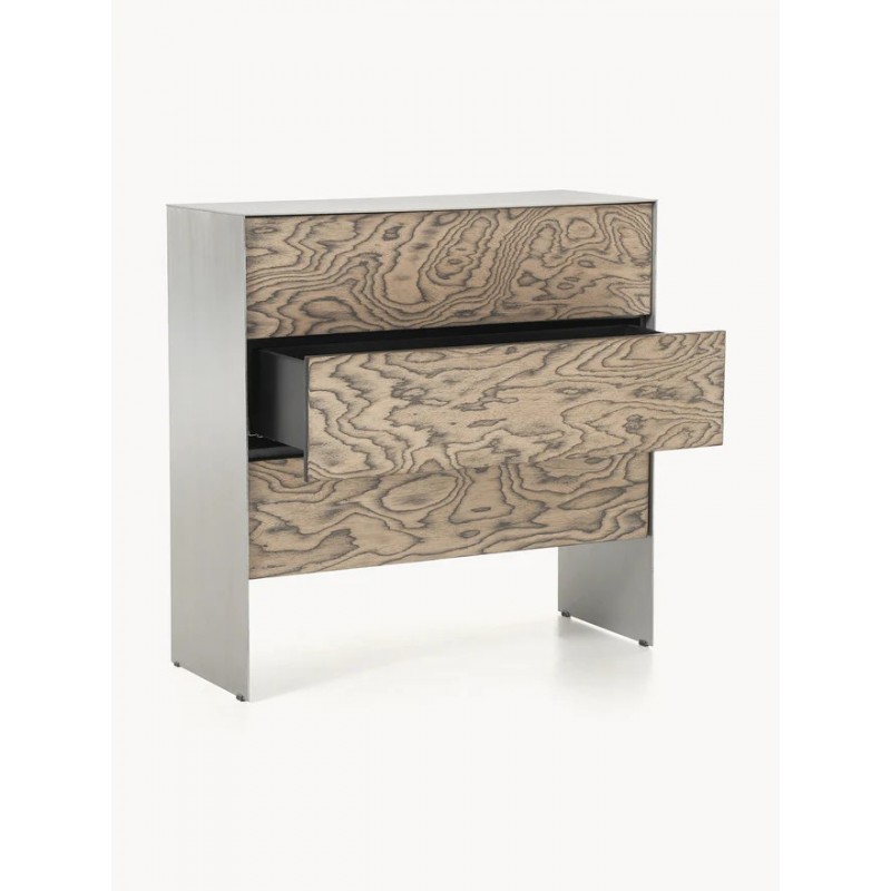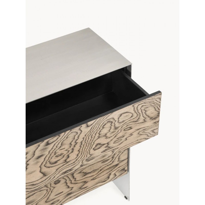 AKO to idealne połączenie nowoczesnego szczotkowanego metalu i pięknie wzorzystej okleiny. Komoda posiada trzy szuflady. Szuflady są wyposażone w mechanizm cichego domykania