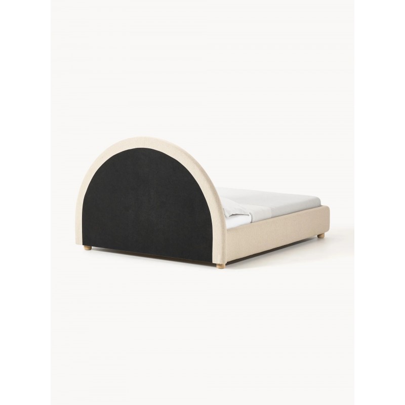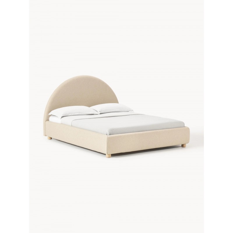 Łóżko tapicerowane z miejscem do przechowywania. Dodatkowym elementem przyciągającym wzrok jest zagłówek w kształcie półksiężyca. Oferta obejmuje stelaż, ale nie obejmuje materaca.
