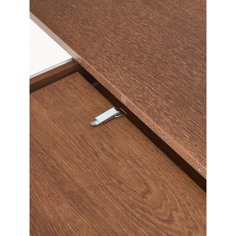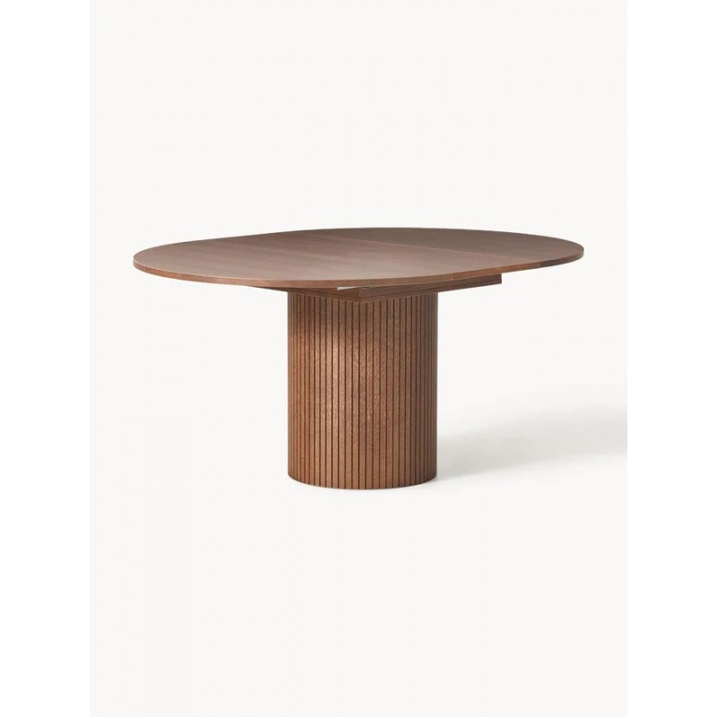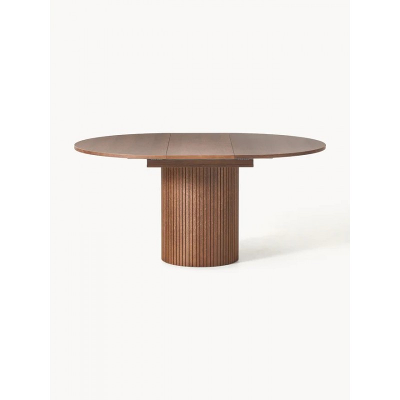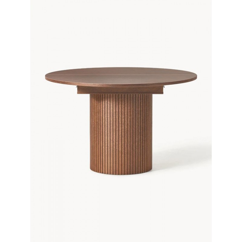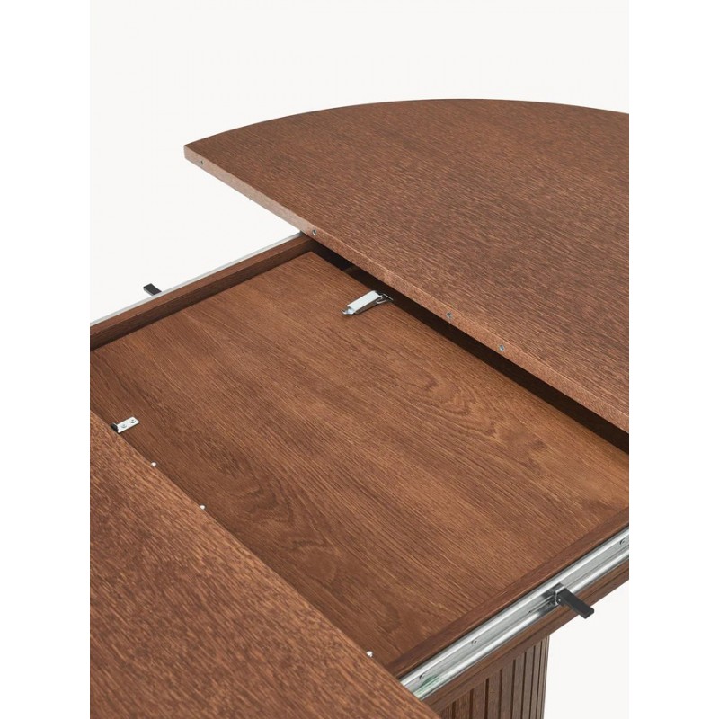Stół okrągły rozkładany, kolor ciemnobrązowy, noga okrągła ryflowana. Stół dla maksymalnie czterech osób bez rozłożenia i dla sześciu osób po rozłożeniu. Łatwe rozsuwanie za jedną stronę dzięki mechanizmowi na linkach. Dokładka szerokości 40 cm chowana w stole. Podwójna blokada rozsuwania.