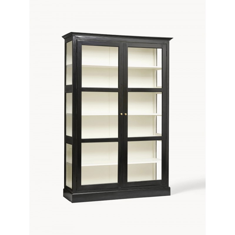Piękna witryna z litego drewna mahoniowego, ręcznie malowana, posiada sześć poziomów (5 półek). Drzwi szklane zamykane na zamki magnetyczne, delikatne gałeczki metalowe w kolorze antycznego złota.